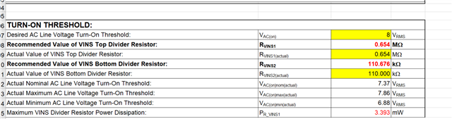 您的 Excel Vout 目标为85Vdc、但原理图具有75V 的标签、并且原理图 VSENSE 分压器电阻器可编程为105V 至130V 之间的任何值!