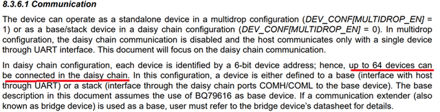 您好,请问菊花链级联BQ79616最多级联多少片?