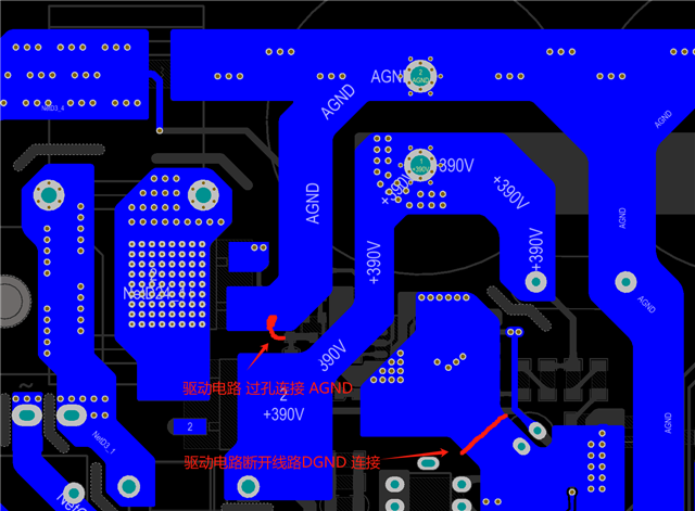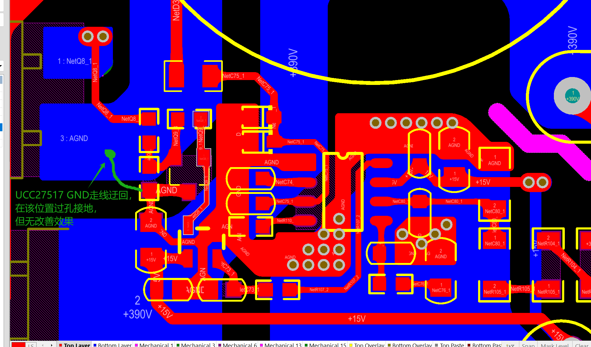我分析电路,发现配置的栅极驱动电路GND连接与MOSFET 源极连接网络走线太长,栅极驱动的参考电平容易出现电位差;因此对电路进行改进如下,栅极驱动电路GND连接改为过孔就近接热地连接,断开驱动网络与DGND的连接,但是测试效果没有明显改善,想请教下这种改进思路是否正确,或者是否有其它的改善方向