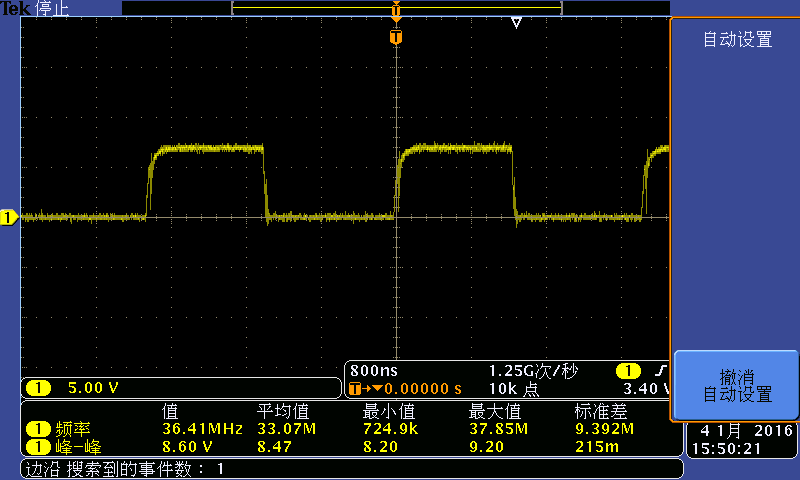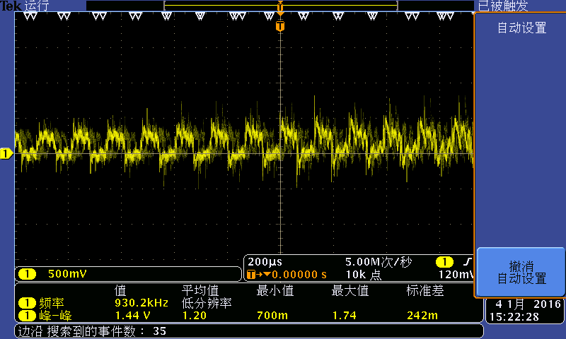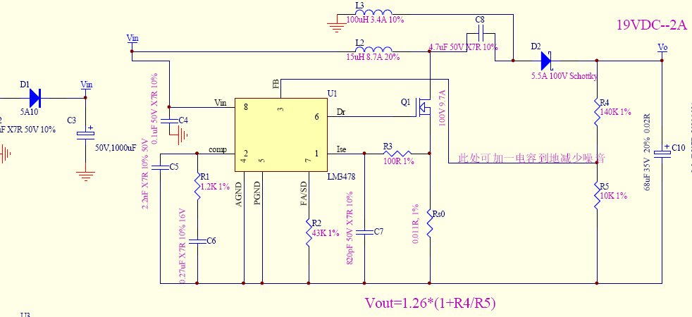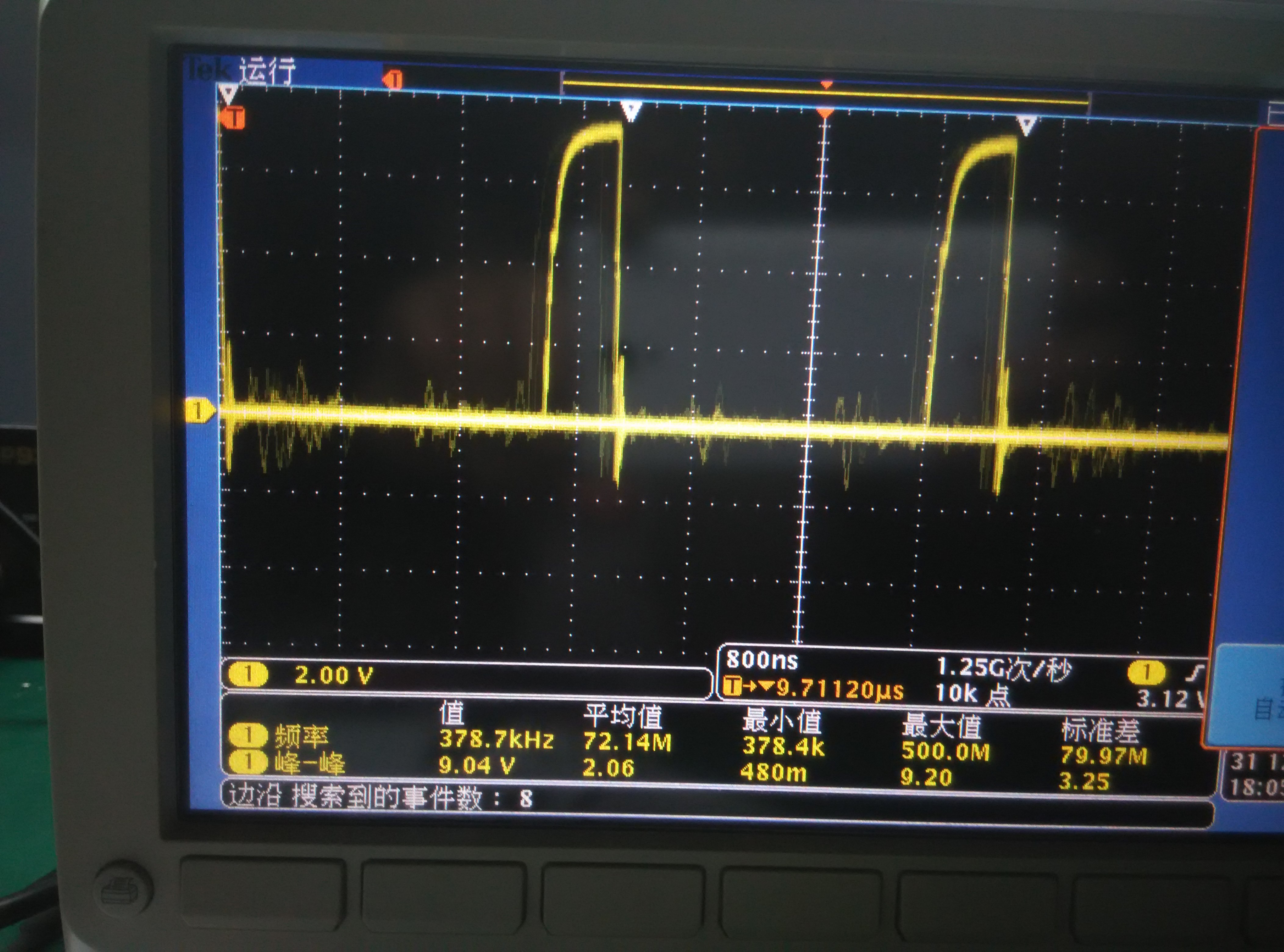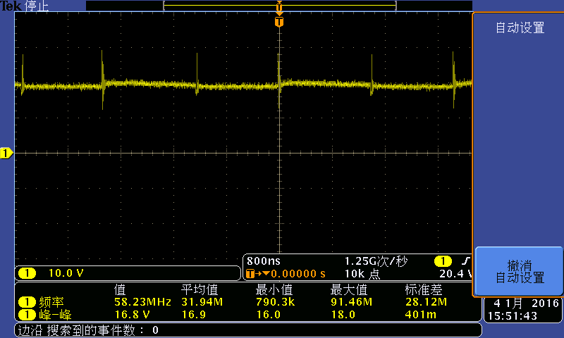 你好,你的意思是电感的饱和电流有可能达不到标称?还是我原理图上的电感选型本身就是有问题?今天又试了下,开始用电阻试带载30R/20W,电压从空载的19.3VDC拉低到18.7VDC,板子上有响声;后面用负载仪试了下,一带载就会过流保护;输出R5位置并一个1uF电容,FB脚的纹波反而比没加电容更大;空载时的Dr脚Vg的波形如下图: