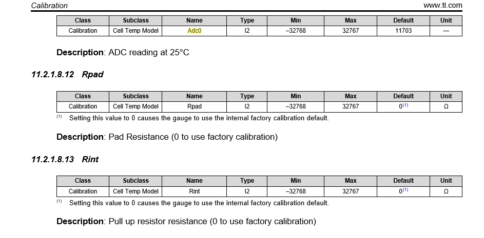 我们使用的103at-2,但是使用默认的值计算出来的温度和实际温度相差太多,需要重新填写系数,你发的计算工具里面的模型和bq40z60的不一样,我使用的是bq40z50的计算温度系数的工具(bq40z60和bq40z60相似,见附件);但是我不知道rRc0 ,Adc0,Rpad,Rint这几个的含义,不知道怎么填写;手册是有这样的描述