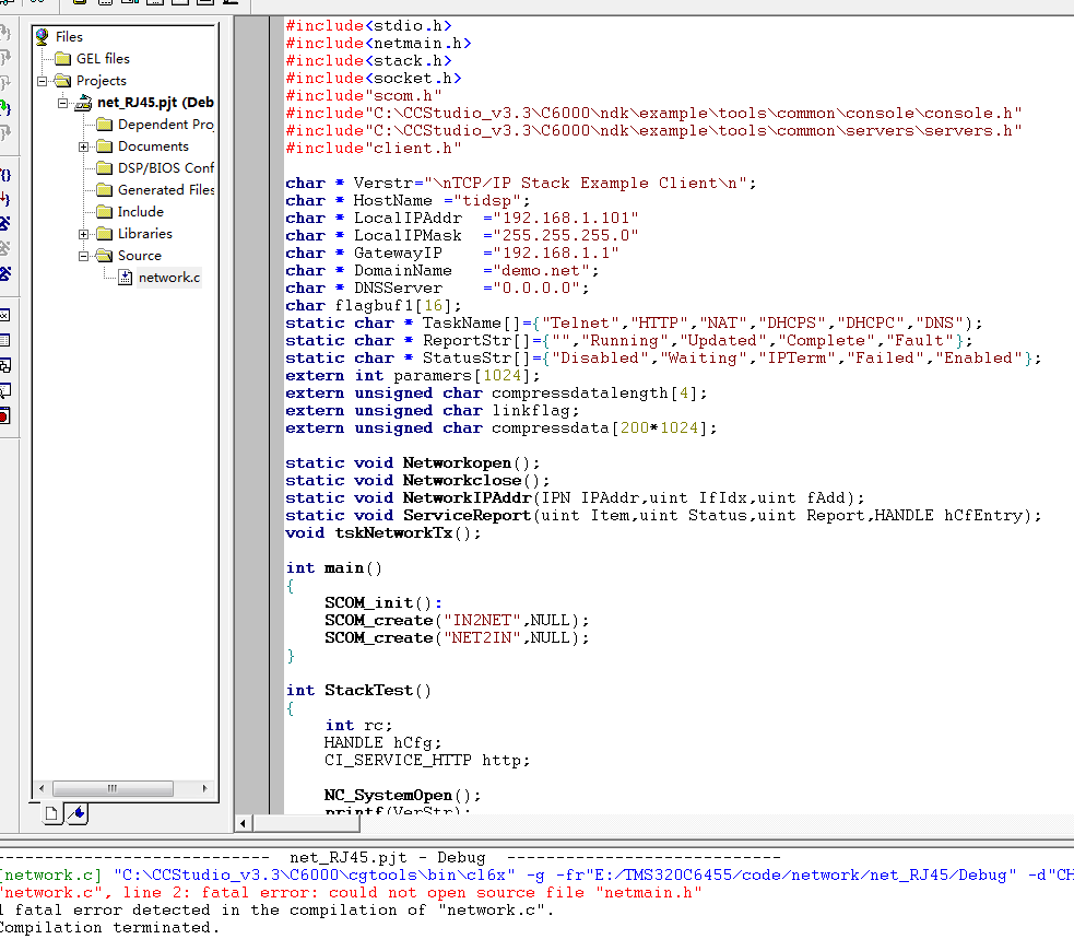 [network.c] "C:\CCStudio_v3.3\C6000\cgtools\bin\cl6x" -g -fr"E:/TMS320C6455/code/network/net_RJ45/Debug" -d"CHIP_6416" -mv6400 -@"net_RJ45/Debug.lkf" "network.c"