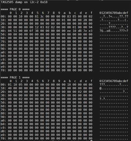 Use aplay to play the audio. The registers on the first and second pages of the tas2505 are as follows.