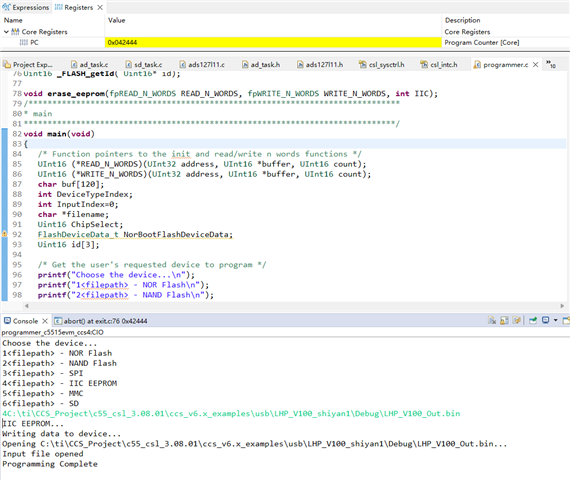 I downloaded the CSL_USB_MSC_dmaExample_Out.bin file generated by hex55.exe to the IIC EEPROM on the control board with the TMS320C5515 chip as the processor using the programmer_c5515evm_ccs4 program, but the program does not run as expected, although it runs correctly during debug.