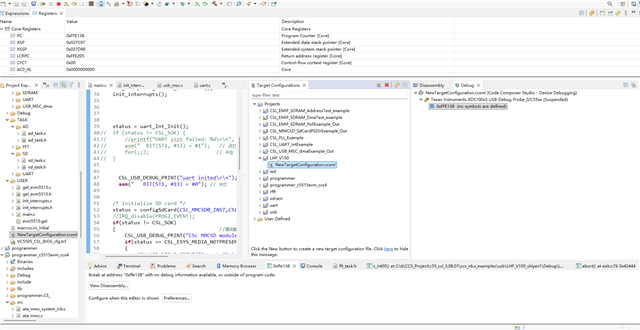 • The PC is at 0xFFE138 is indicating that the code is in the ROM bootloader, something is wrong with your flashed image in EEPROM. If you load the symbol of the application image for the ROM bootloader, then the disassembly is meaningless.