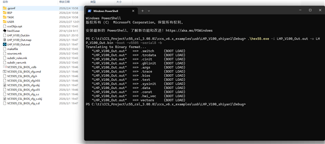 .hex55.exe -i LHP_V100_Out.out -o LHP_V100_Out.bin -boot -v5505 -serial8 -b