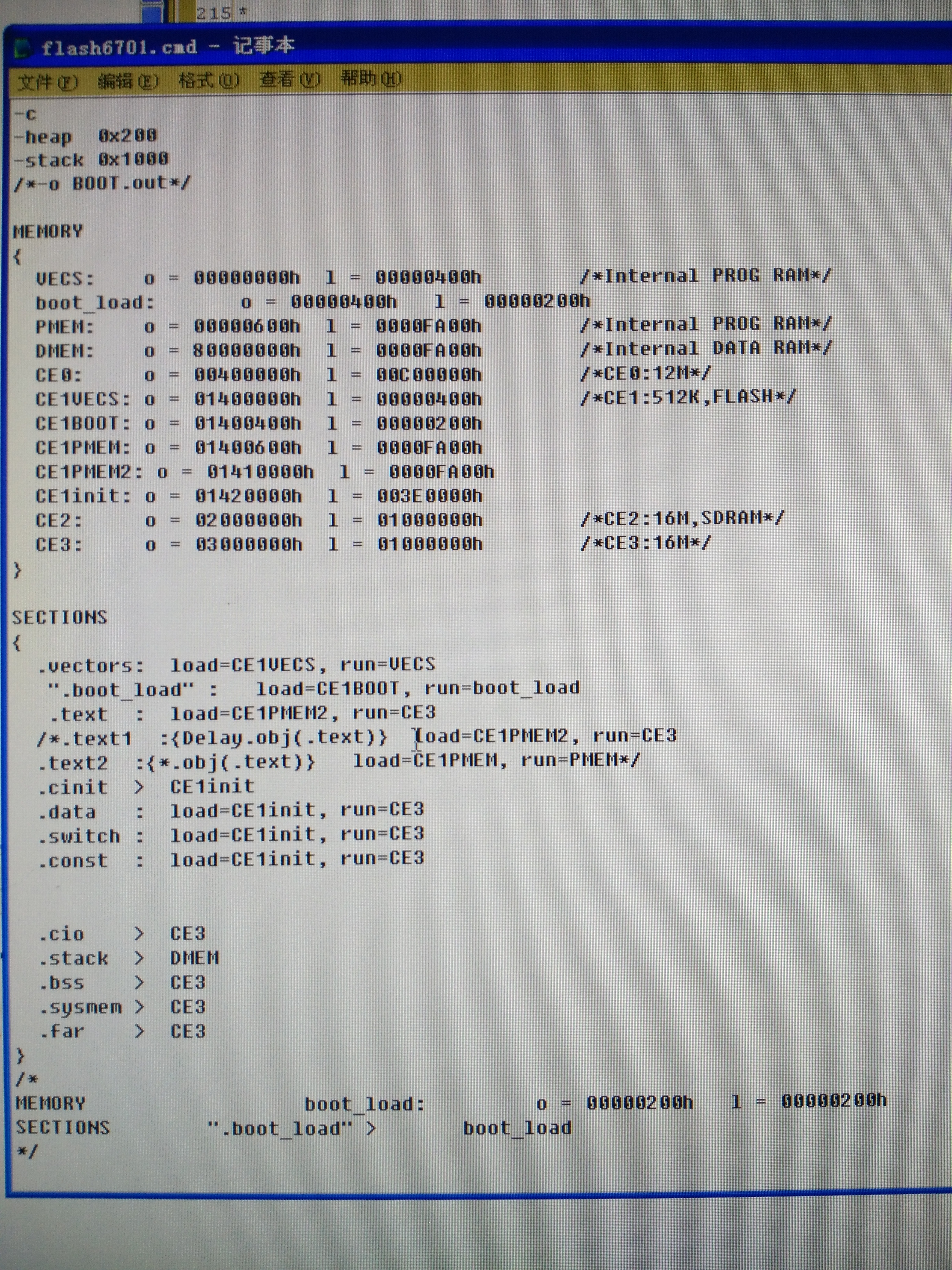 6701以map1方式运行,由于程序太大,.text段超过64k,不能全部放在片内程序存储sram中,因此将该段拆分成两段,一部分放在片内,一部分放在片外sram,在debug模式下程序运行正常,但是将程序烧写到flash中以二次搬移的方式自主运行时则无法运行。