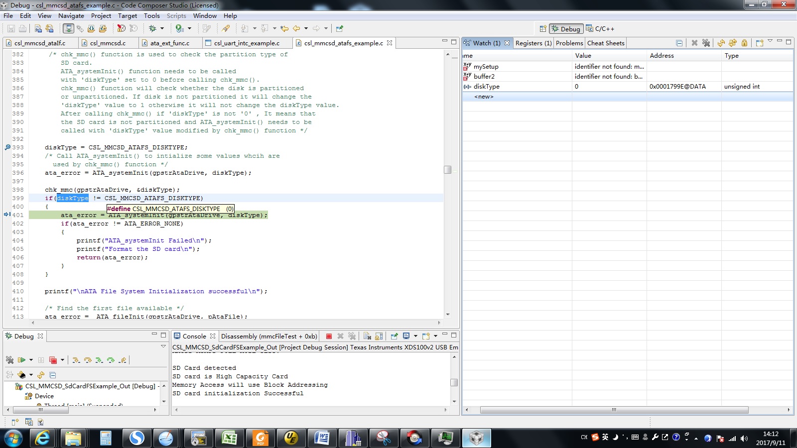 在使用eZdsp5535评估板的例程CSL_MMCSD_SdCardFSExtExample,发现在ccsVersion: 4.2.4.00033的情况下会跑飞。单步跟踪了一下,发现在如图399行的地方会出现异常,本来disktype的值在watch里面显示为0,CSL_MMCSD_ATAFS_DISKTYPE的值也是0,但是399行的判断依然进入了,十分费解,请问为什么会出现这种情况?
