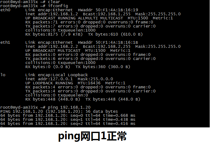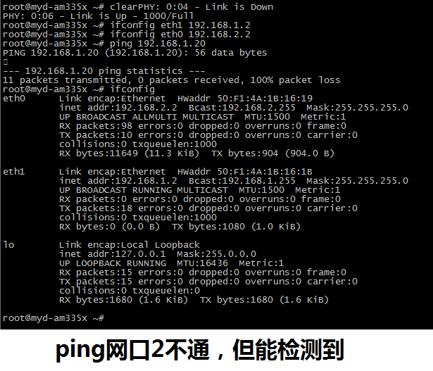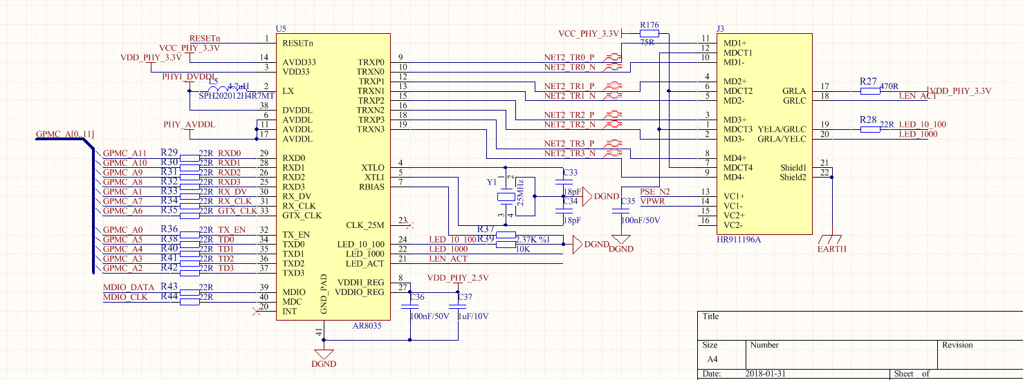 我购买了米尔科技的开发板,并买了3个核心板,在米尔科技的开发板上测试网口1 2工作都正常。自己做了底板,采用与米尔科技的PHY芯片(AR8035)一样的芯片,并且原理图也是照抄,现在是网口1工作正常,网口2采用AR8035的一路ping不通,但能检测到网口的状态,如附件。应该是硬件问题,但实在没法了,折腾了2天了,PHY芯片的供电都正常(3.3V,2.5V,1.1V),电脑设置成100M时连接,ping也不通,自动协商未1G时测试两个CLK都为128MHz左右,100M时为25MHz左右,希望工程师能提点测试或定位的方法,谢谢!