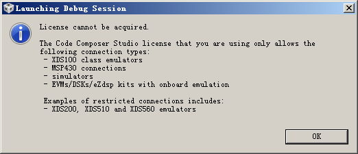 开发环境使用的是CCS6版本,使用XDS200连接到PGA900,想进行Debug时,弹出了上述问题,这是不是涉及到license权限?? 请问有什么办法可以解决??