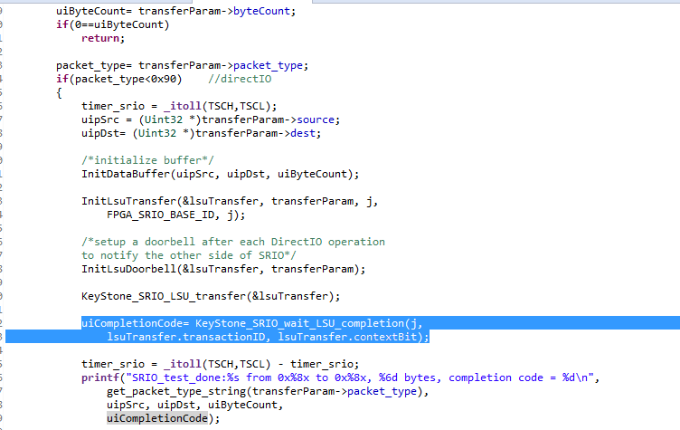 用官网的SRIO测试例程,测试6657和FPGA之间的SRIO通讯,(在no loop 模式下测试)DSP复位后的,第一次运行程序,FPGA能成功收到数据,但是用一个循环多次运行DSP_test()函数就不能正常运行下去,第一次执行循环的也能运行,但第二次开始之后就一直卡在waitcomplete 那?什么原因?求解答