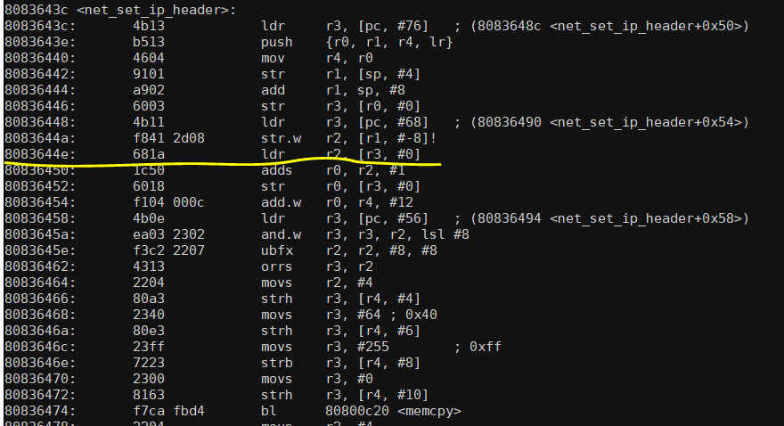 结果在net_set_ip_header函数哪里跑飞了,查了很久没有找到原因