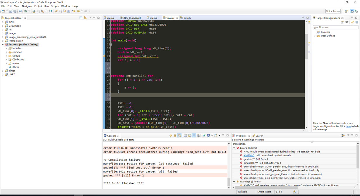 你好!我想使用OpenMP进行多核开发以加速算法的效能,使用的是C6657,使用预编译指令"#pragma omp parellel for"时编译都会报错(如图)。我添加了头文件的路径,#include <omp.h>,在advanced optimization里使能了openMP3.0的支持。