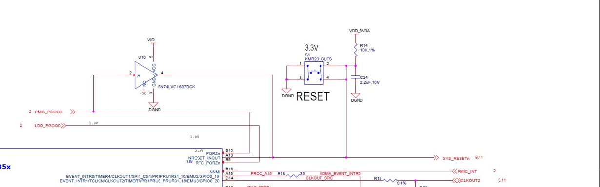 而PMIC_PGOOD直接与B15连接,说明PMIC_PGOOD也是3.3V电平的,但是U16的缓冲驱动器芯片的电压却是VIO的,而VIO是1.8V电平的,通过U16连接到AM335X复位引脚后,又有3.3V的上拉接的按键,这里的U16的电平怎么会是1.8V的呢?