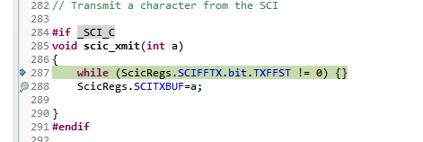 使用官方例程 Example_2833xSci_Echoback.c,进行调试,为什么单步运行的时候到这一步,这个标志位就一直是(fifo里一直有数据没能发送出去吗?),无法跳出while的循环,超级终端无法接收到数据。全速运行的时候又能够运行,且超级终端能都接收到数据。请问是什么原因?还有就是如何将数组数据通过sci发送至上位机呢?循环发送吗?