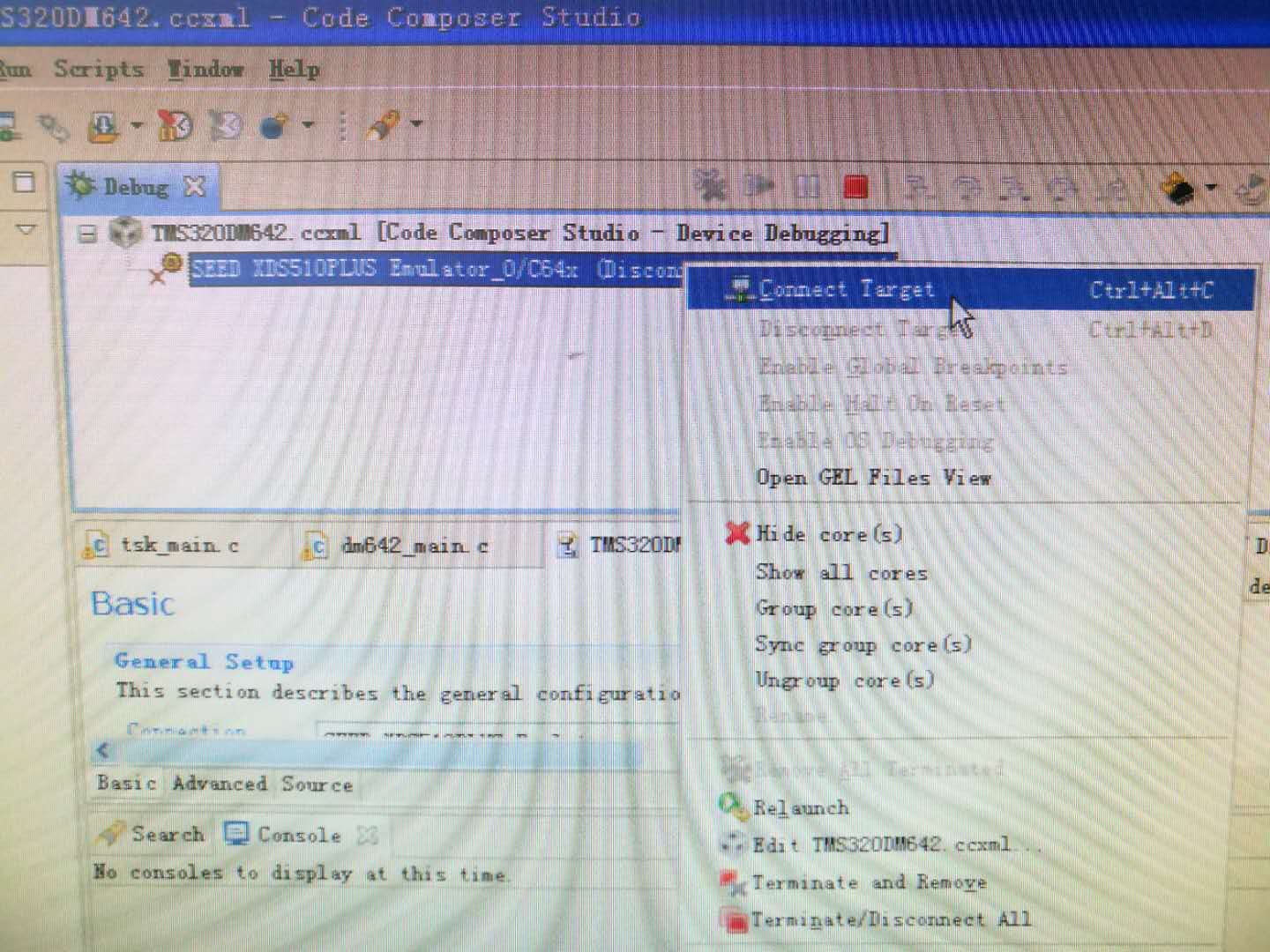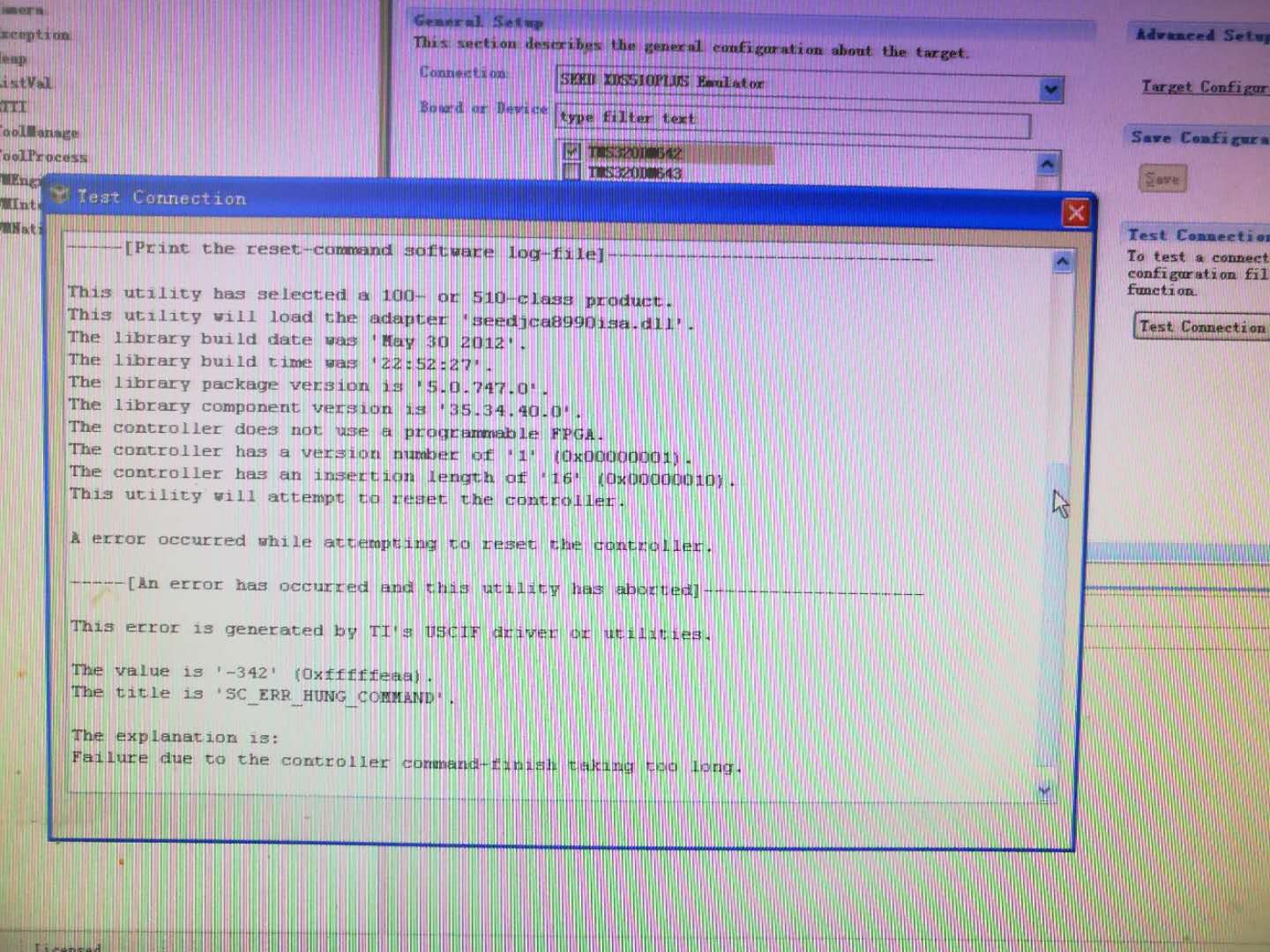 通过重装CCS5.2和使用新的仿真器,发现之前不能debug的dm642芯片能够仿真调试了,但是仍然有两块dm642芯片不能debug调试,CCS5.2通过xds510plus connect时,CCS5.2会闪退。现象是CCS5.2能够通过tms320dm642.ccxml中的test connect和dm642进行通讯,但是debug connect时就会闪退。附图片如下。请问一下大家有没有碰到过这种情况,可能是由哪些原因造成的?