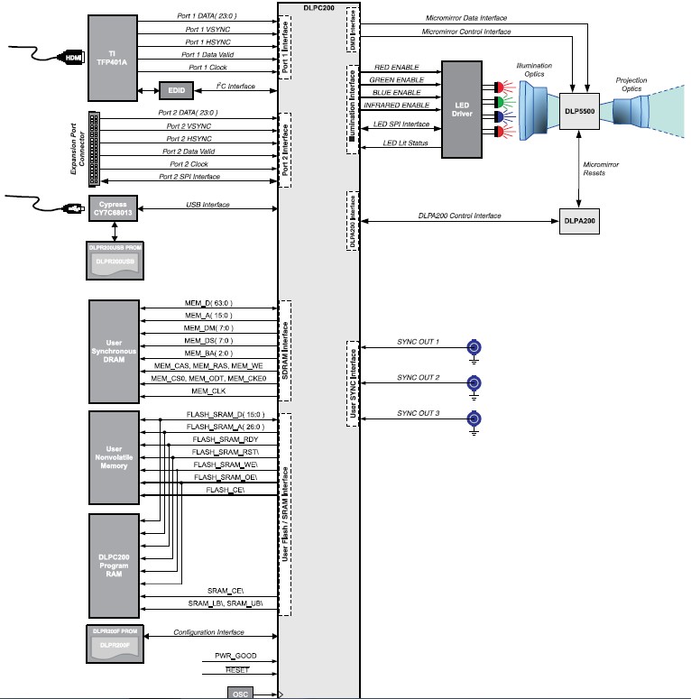 Three (3) SYNC outputs are provided to enable the system to synchronize external systems or components to the pattern being displayed on the DMD. For example, an application may desire to trigger an in system camera to capture and image after a certain pattern is projected from the DMD. In this case, one of the three output SYNCs can be configured to provide a pulsed signal just after the pattern is set on the DMD, thus enabling the camera to capture the projected DMD pattern. These outputs are programmable (delay, pulse width, polarity) via the DLPC200 API, and can be updated in real-time.