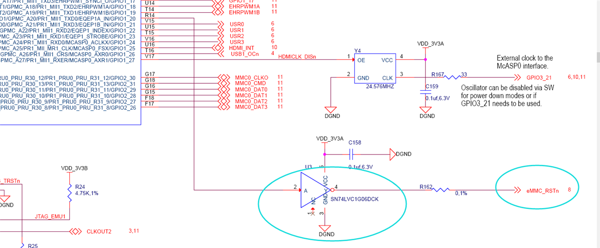 BBB原理图中,接emmc的REST用的一个SN74LVC1G06DCK接到335X的I/O口,请教下这个作用是什么?另外,如果去掉这个芯片,REST脚直通到338X的I/O脚,会出现什么问题?
