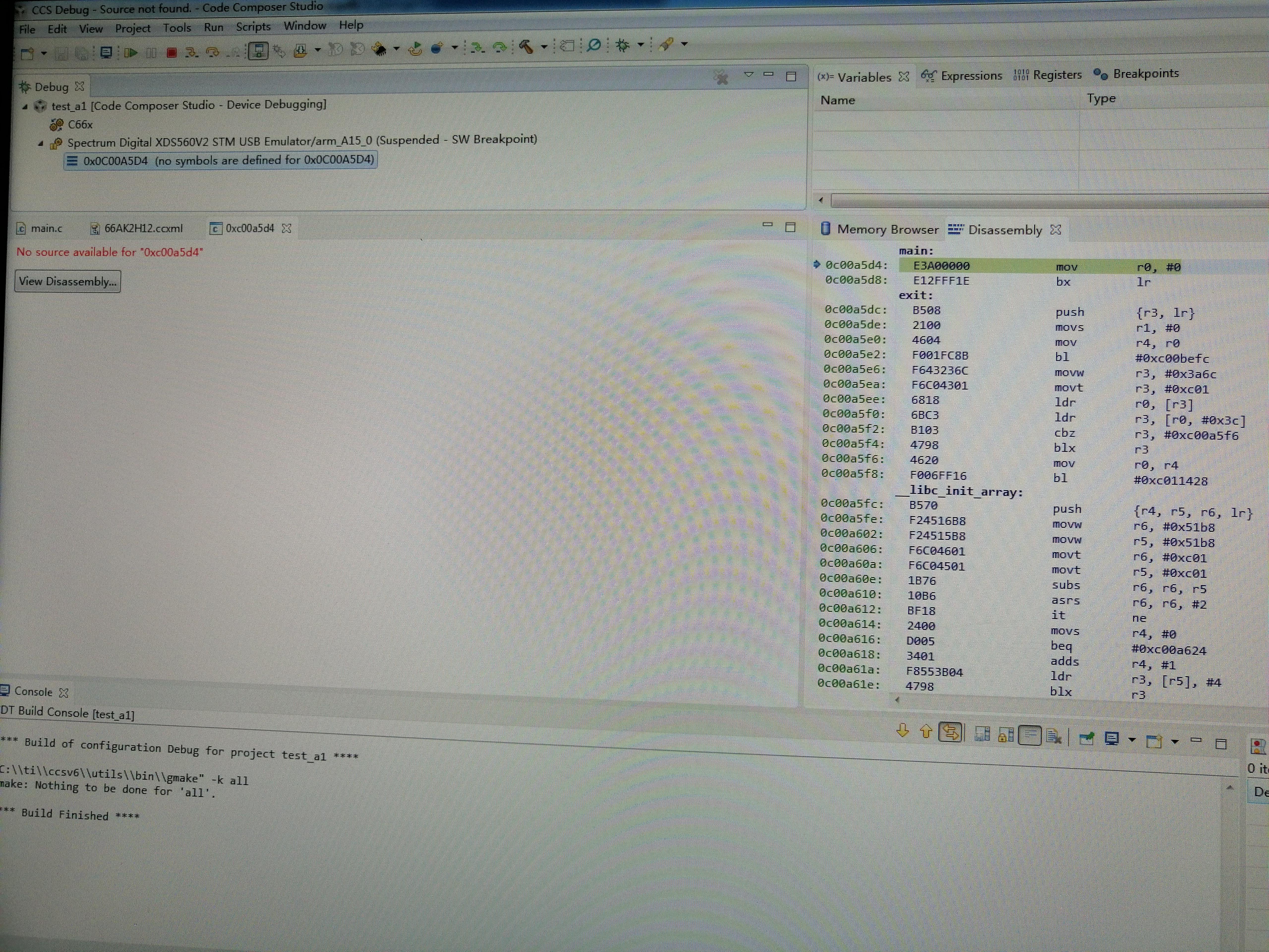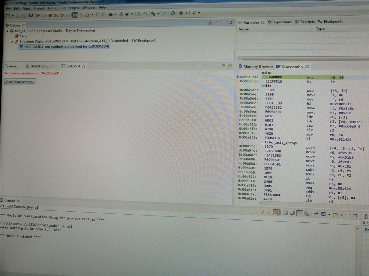 现象是:连接到仿真器后,程序的指针直接指到汇编的main入口,而相对应的C程序的main入口并没有出现指针。C程序里面断点也加不上。