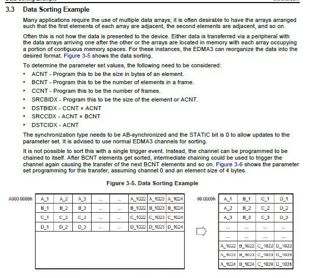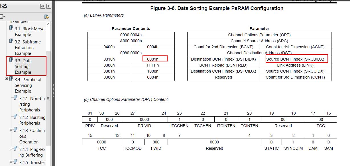 最近在学习KeyStone Architecture Enhanced Direct Memory Access (EDMA3) Controller User's Guide 这份文档,其中在3.3章节有例子3.3 Data Sorting Example,为什么Source BCNT Index (SRCBIDX)是1而不是4?