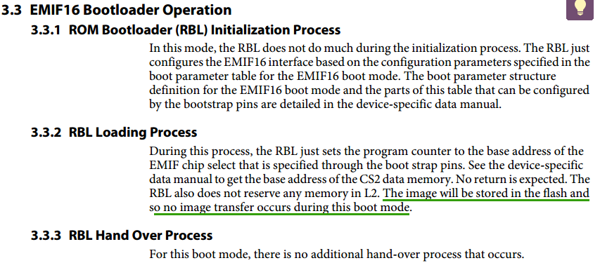 在sprugy5c 第24页 3.3.2有如下内容,请问画绿线部分如何理解?bootloader的过程不是将外部FLASH中的代码搬移到片内存储器然后执行吗,为什么画绿线的部分显示没有代码搬移?这种模式究竟是怎么用的呢?