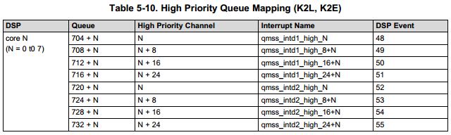 当选择驱动程序管理累加器列表和ISR时(即:rxCfg.bManageAccumList=1;),在DSP中,高优先级队列 和 累加器通道有如下表。