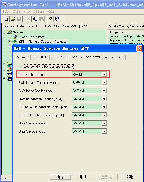 step2.打开.tcf文件,将.text段从原来的SARAM改为SRAM,即SDRAM。