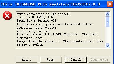 我的C6713的开发板以前能和仿真器连接,有一次烧写了一个程序后,就再也连接不上了,总是提示错误:Error connecting to the target: Error 0x80000200/-1060 Fatal Error during: OCS。有时候还提示这样的错误:Error connecting to the target: Error 0x80000200/-1060 Fatal Error during: OCS  请问是什么原因?谢谢