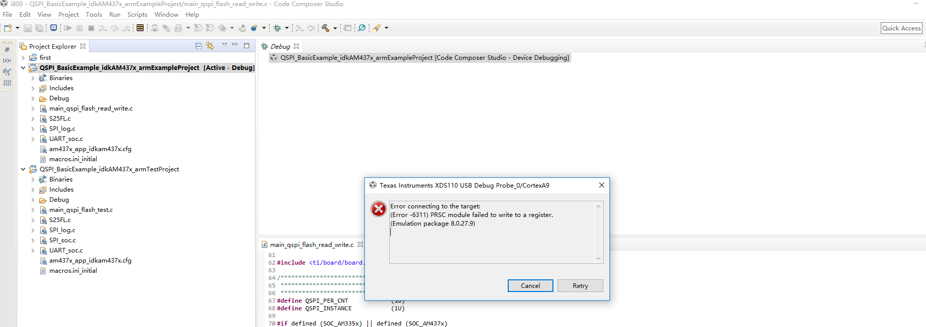 AM4378芯片,当使用XDS110下载QSPI 启动方式的uboot时,debug显示error-6311:PRSC module failed to write to a register.