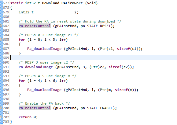 在自己画的C6678板子上使用...\ti\mcsdk_2_01_02_06\examples\ndk\helloWorld\evmc6678l路径下的hello world例程调试网口,在下载PA固件时跑到启用PA即下图中的第700行时会跑飞,显示错误No source available for "Pa_resetControl(void *, int) at 0xc32b090" ,请问各位这是什么原因呢?
