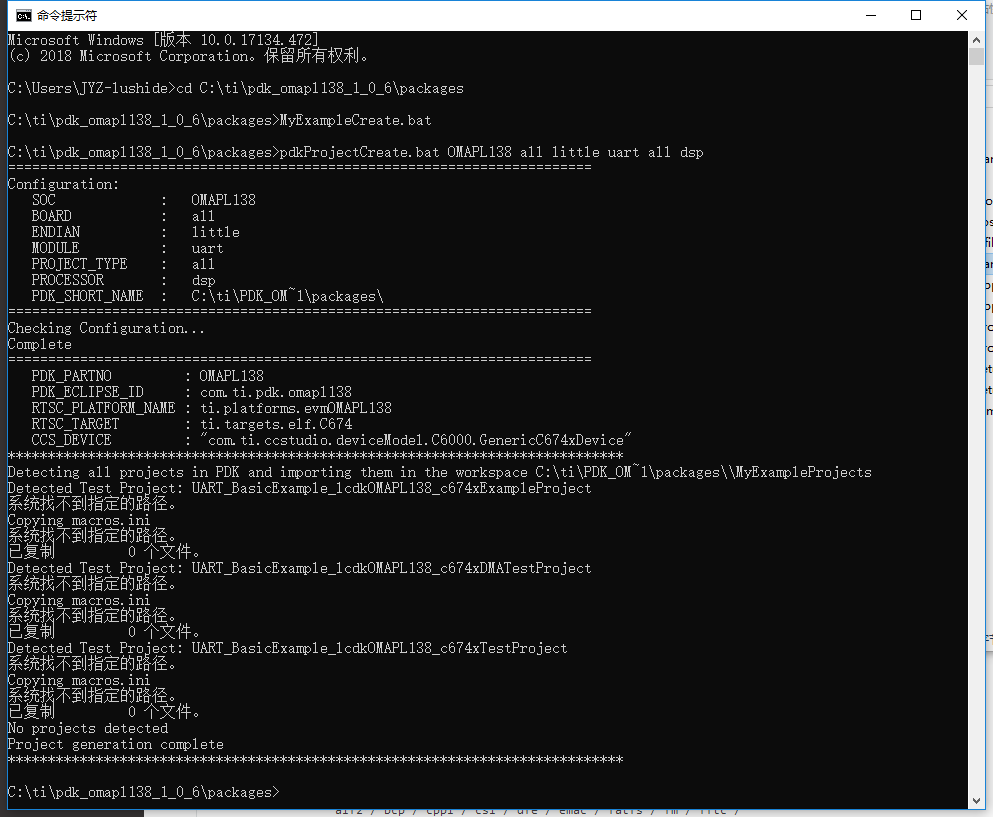 我安装好了CCS和PDK_OMAPL138,在C:\ti\pdk_omapl138_1_0_6\packages目录下新建了一个MyExampleCreate.bat文件,内容为: