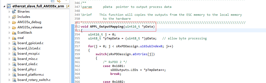 如图所示,在ethercat_slave_full工程里面,在tiescappl.c文件里定义了函数APP_outputMapping,但是在main里没有调用,怎么知道这个函数在哪被调用了。谢谢指导