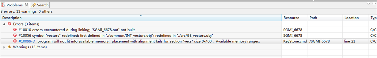 "../KeyStone.cmd", line 21: error #10099-D: program will not fit into available memory. placement with alignment fails for section "vecs" size 0x400 .