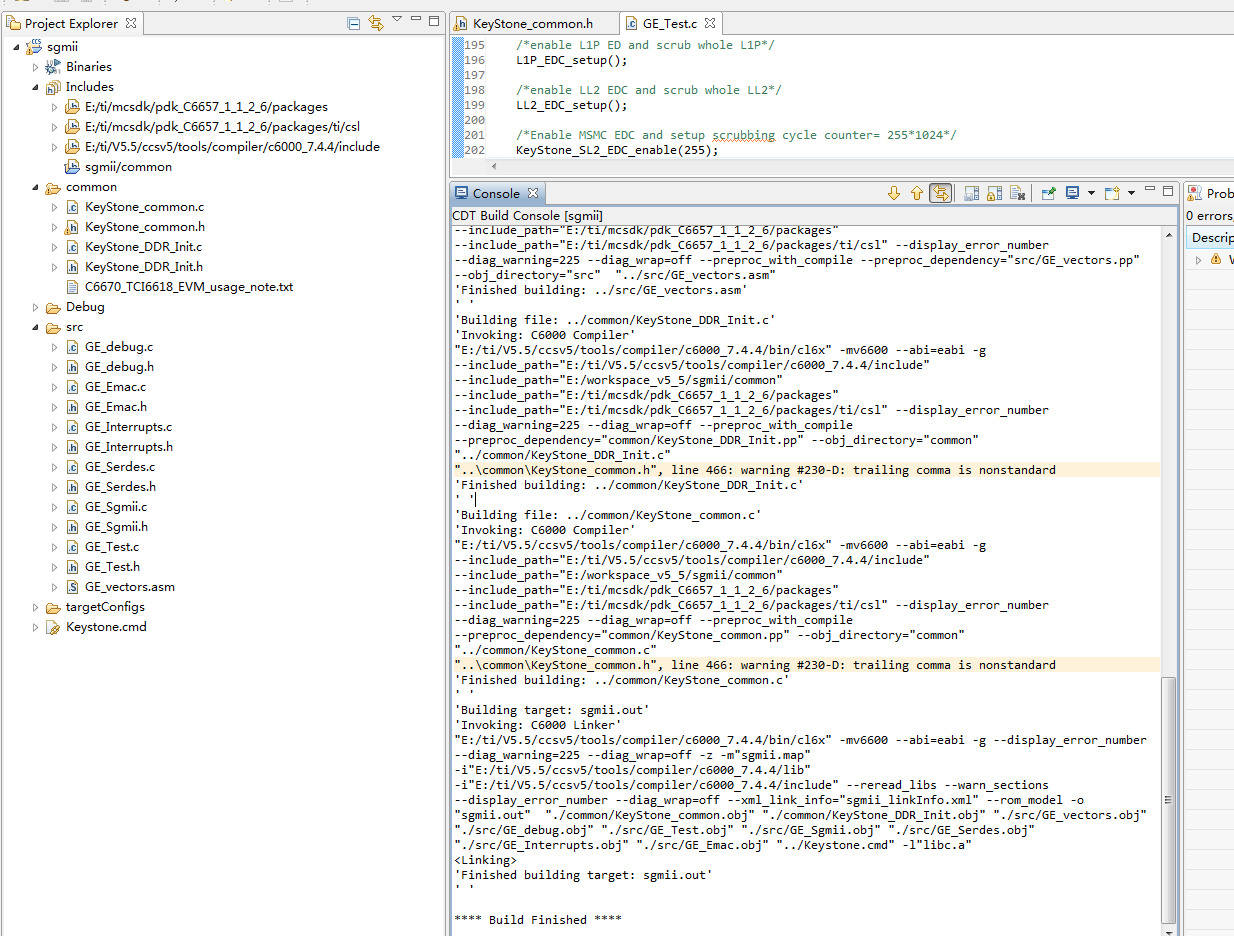 在论坛里找到C6657_EMAC_Example这个例程 编译是成功的!但是很奇怪common文件夹里只用到了:
