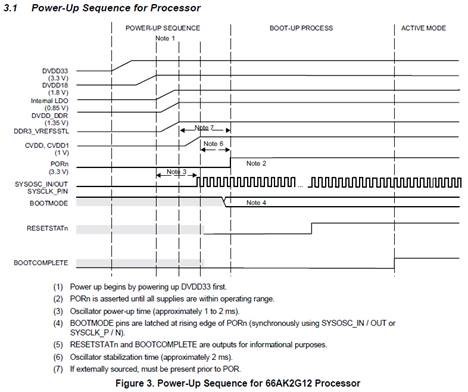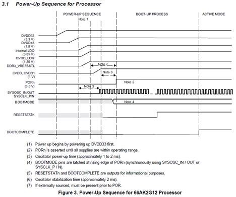 但是在“66AK2G1x 多核DSP+Arm KeyStone II 片上系统(SoC)”这篇文档里,关于K2G12的上电时序图在5.9.1.1节的Figure 5-3描述如下图所示,从下图看,DVDD18、DVDD_DDR、CVDD& CVDD1之间好像没有明显的先后顺序,所以我有一个疑问是关于DVDD18、DVDD_DDR、CVDD& CVDD1,这三组电源的上电顺序有先后之分吗?因为我们的PCB空间有限,如果DVDD18、DVDD_DDR、CVDD& CVDD1有上电时序要求,可能会增加我们的上电时序控制电路面积;