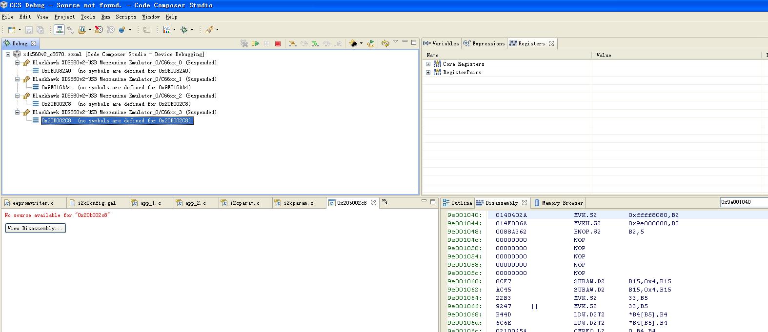 5.连接仿真器后观察启动结果,发现core0和core1的PC指针指在0x9e00xxxx的空间,而core2和core3继续停在0x20b002C8的地址,不知是何原因,结果可以见附件。