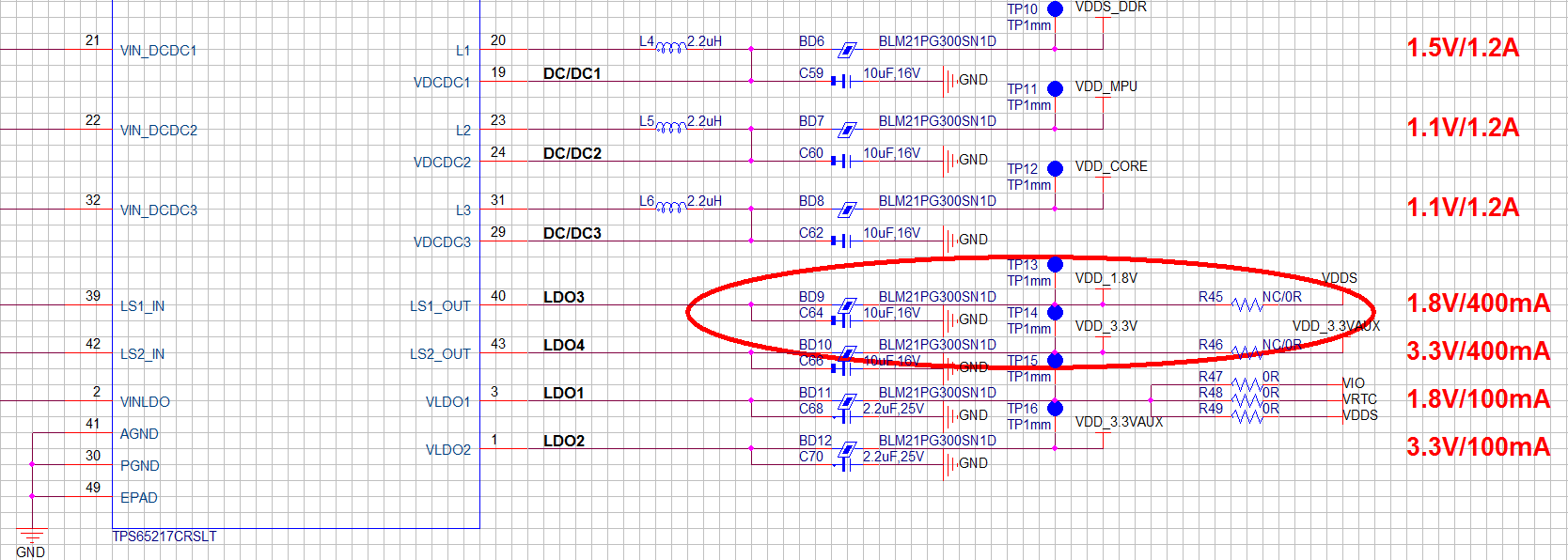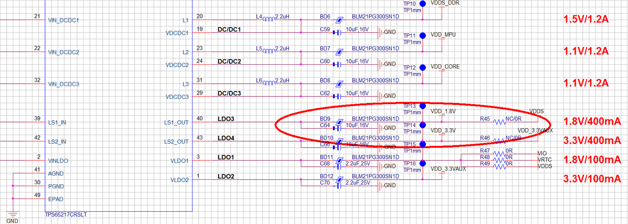 在后续测试中“基本确定”(基于自己的测试与判断)是由TPS65217C的LS2_OUT(即LDO4)管脚输出的VDD_3.3V电压导致,因为在测试中“只有”将VDD_3.3V电压断开(去掉磁珠BD10)后该现象消失,断开板卡上其它所有电压该现象均存在。