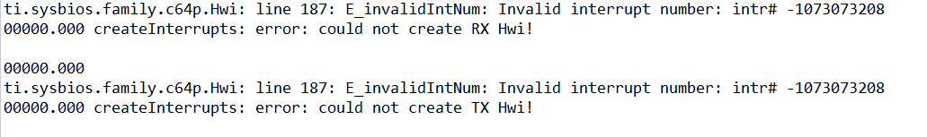 你好,开发板C6748,我使用ccs8.2 编译器TI V8.2.4 SYSBIOS 6.75.1.05 NSP 1.10.3.15 NDK 2.25.1.11 XDC tools3.51.2.21这些版本都是比较新的,但是仿真时报错提示创建RX HWI 和TX HWI 失败。查看了中断时间和中断号也没有问题啊.应该去哪里找问题呢?