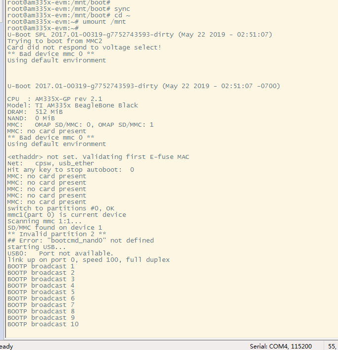2、将eMMC按照sd卡分区,并且将MLO和uboot.img、am335x-boneblack.dtb 与 zImage放入boot区,另外一个区放文件系统。bb black可以启动bootloader,但是启动内核和文件系统失败。