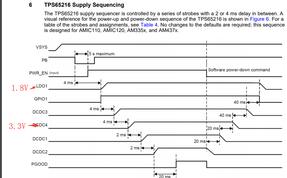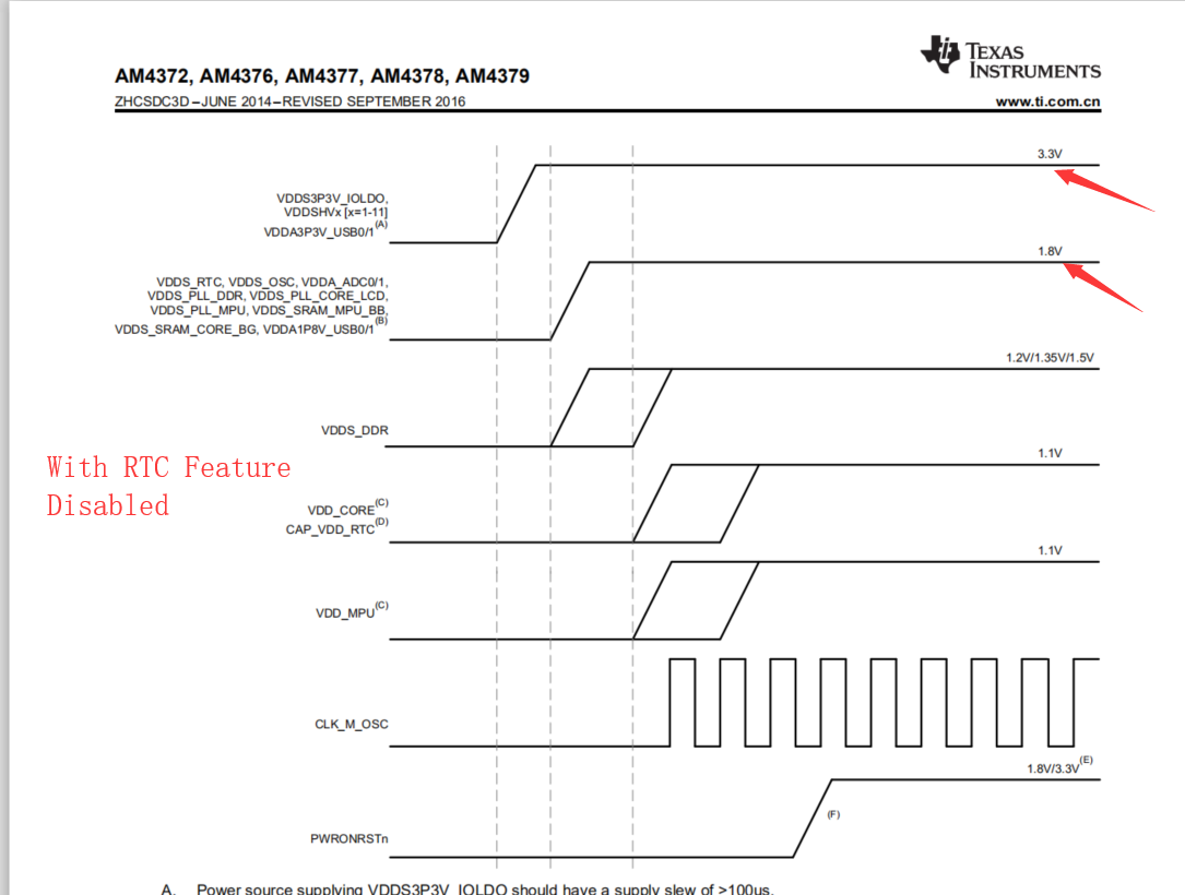 1. AM437X在With RTC Feature Disabled, Dual-Voltage IOs Configured as 3.3 V时要求ALL 3.3V supplies 比1.8V supplies 先上电,见下图1,当采用TPS65216给AM437X供电时,根据TPS65216手册推荐的上电时序 3.3V 在1.8V的后面,见图2和图3  ; 如果采用TPS65216手册推荐的这个上电时序,当AM437X在With RTC Feature Disabled时3.3V与1.8V的上电时序与要求的相反,这样会产生什么影响?
