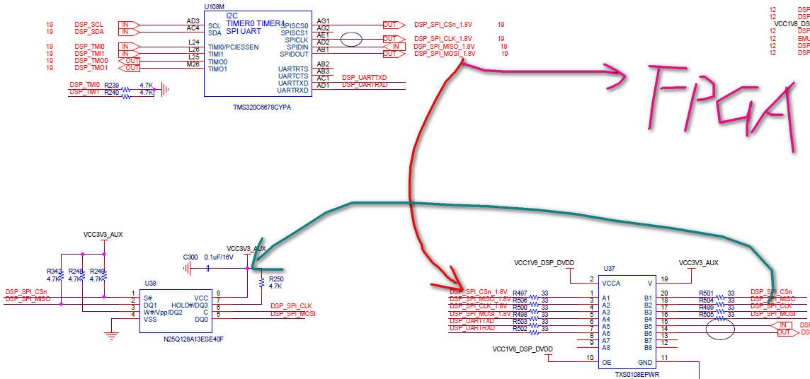 原理图如上图,正常启动,会卡住不动,测试DSP侧SPI引脚均为高电平,拆掉TXS0108,测试DSP侧SPI引脚是有启动信号。开始怀疑FPGA引脚(unused pin)影响信号,将FPGa引脚改为三态,然后还是不能正常启动,但是示波器探头触碰SPI CLK引脚,立刻开始加载程序正常启动。