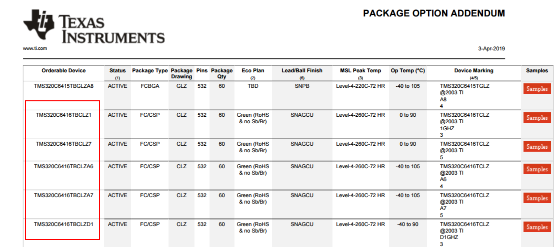 3、这三个型号的产品标识,是不是都是TMS320C6416TCLZ。