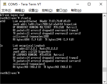 进而按照进一步指示,使用终端程序Tera Term连接EVM,键入 ifconfig查询命令,其中eth0也没有显示IP地址。