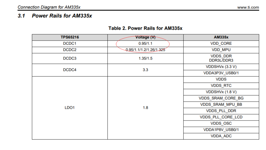 在使用TPS65216给AM335X供电时,mcu最大的频率只能达到600MHZ吗?如下图所示,但是按照TPS65216所提供给的电压值,应该可以达到1Ghz,下图2所示