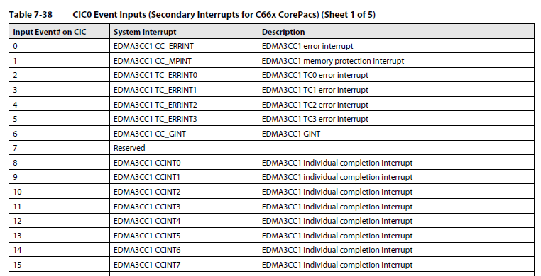 在6678芯片手册中Table 7-38 CIC0 Event Inputs (Secondary Interrupts for C66x CorePacs) 中提到下图所示,