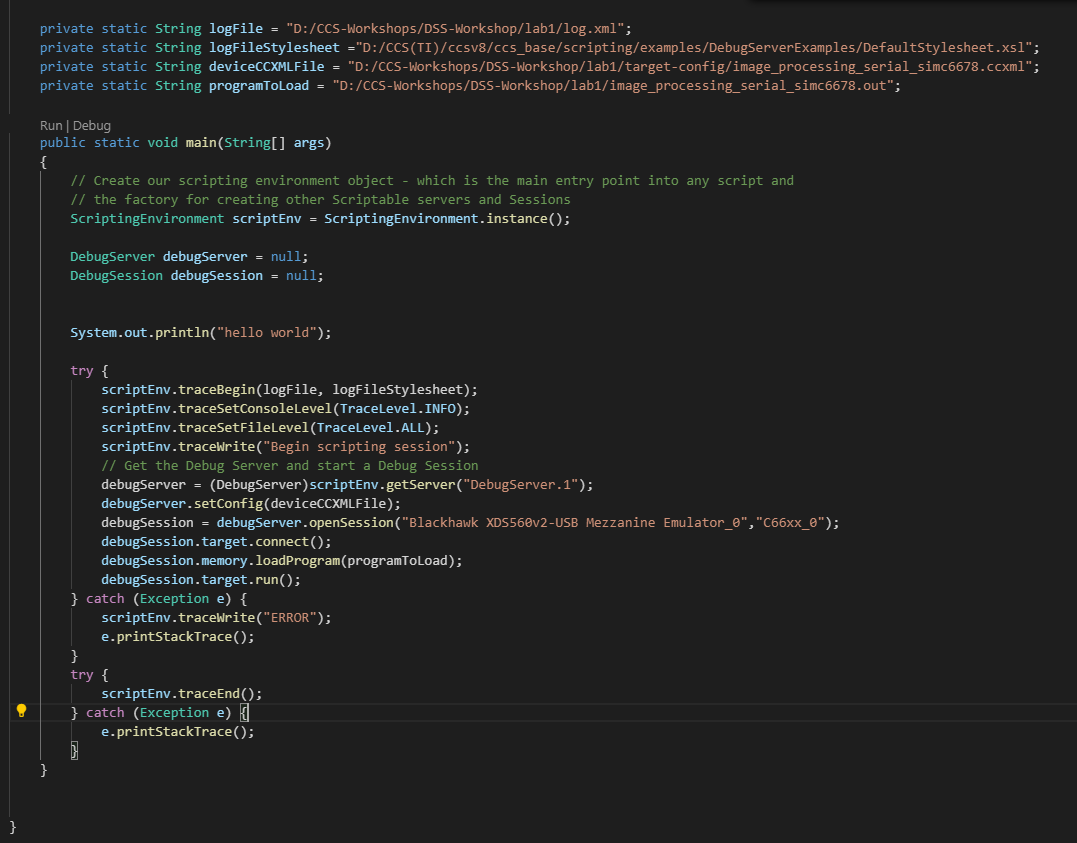 我在C6678开发板上使用DSS进行调试,使用的是java进行开发的,下面是我的java代码: