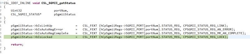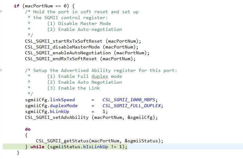 时钟、DDR等都在GEL文件中设置。因为我们自己的开发板硬件是SGMII0端口使用。因此我导入platform_lib_evmc6678l工程,取消了platform_init函数中的Init_SGMII(0)的注释。结果程序会停在如下图所示的循环中。麻烦专家帮我解决一下问题。谢谢!