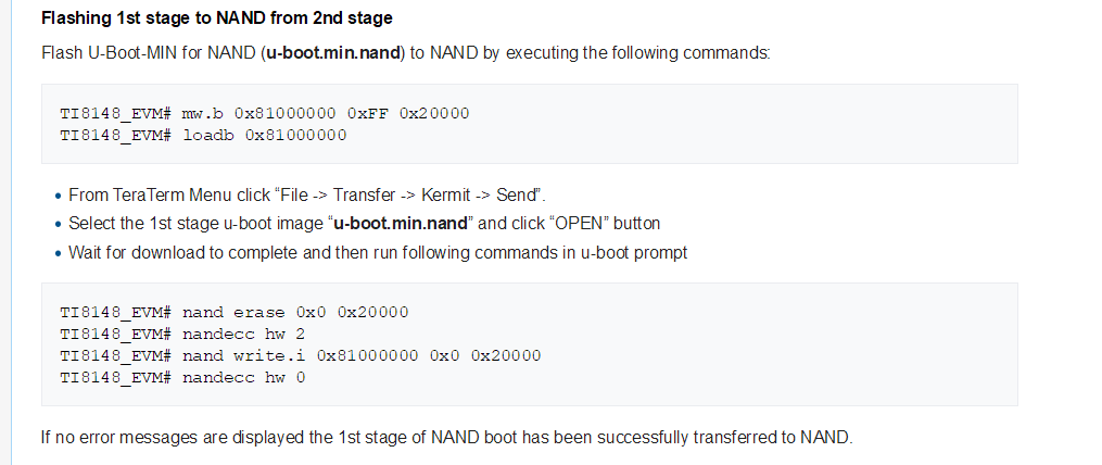 TI8148_EVM# nand erase 0x0 0x20000 TI8148_EVM# nandecc hw 2 TI8148_EVM# nand write.i 0x81000000 0x0 0x20000 TI8148_EVM# nandecc hw 0