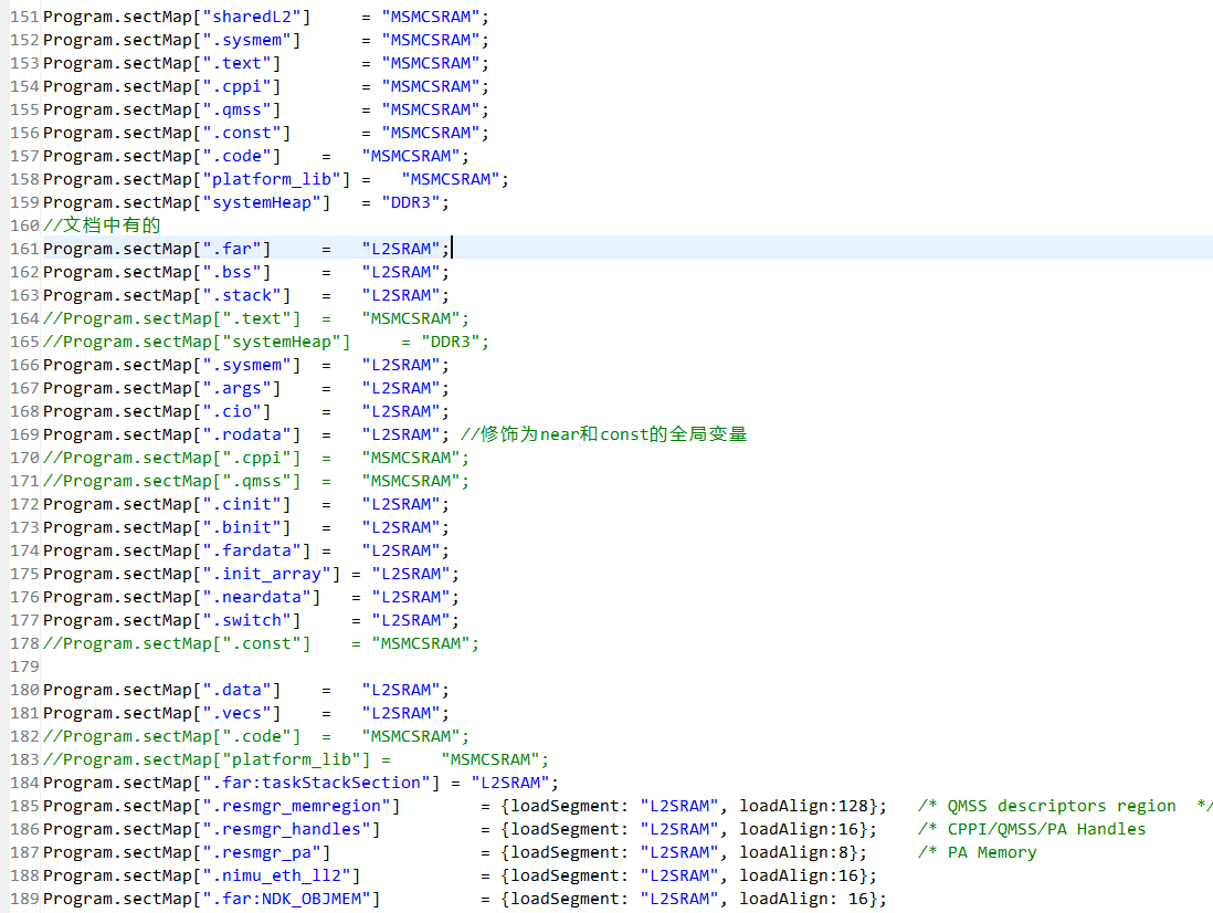 在这个工程中的cfg中除了160行前的那些段分配在MSMCSRAM和DDR,其他都分配到了L2RAM了: