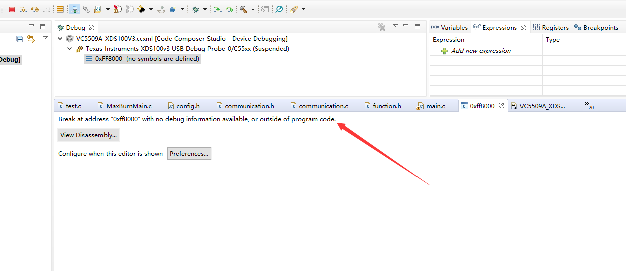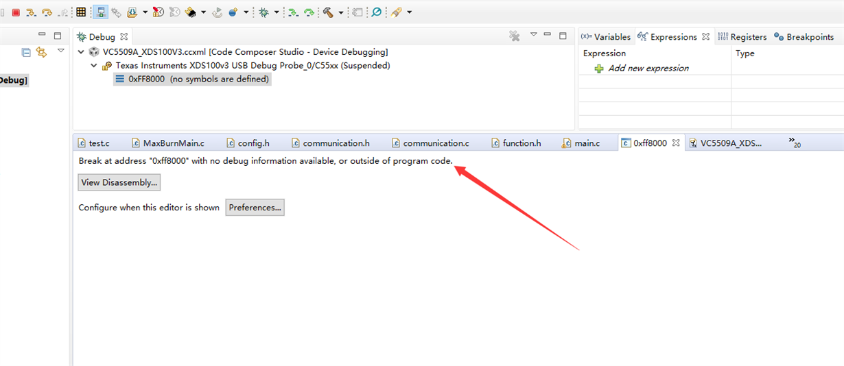 TMS320VC5509A仿真时遇到的问题 break at address "0xff80000"....
